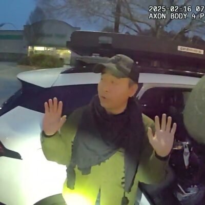 Officer John Lavalley of the Athens-Clarke County Police Department interrogates John Choe, a member of the Religious Society of Friends, who parked his vehicle (a